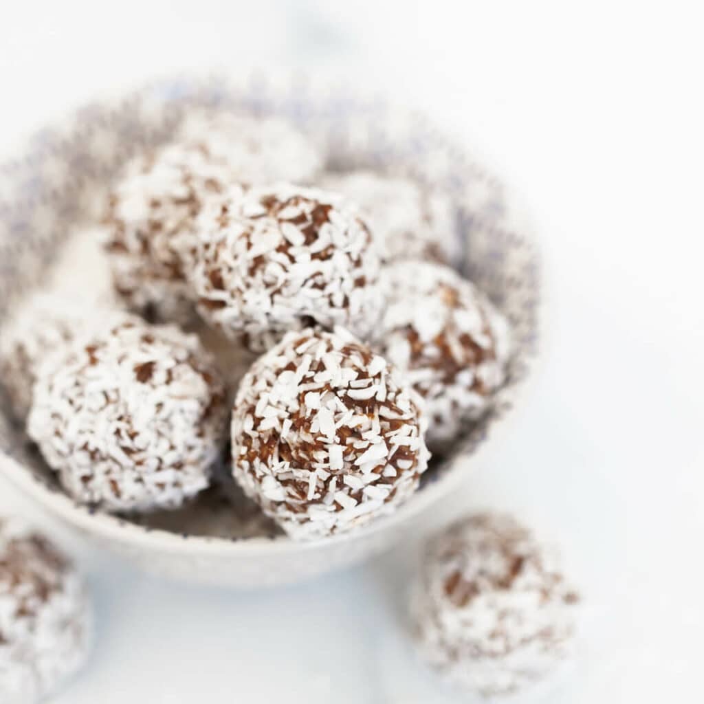 Espresso kochen. Datteln und Nüsse fein häckseln. Espresso dazugeben und das Ganze mischen. Dann die restlichen Zutaten unterrühren, sodass eine etwas festere Masse entsteht. Mit feuchten Händen gleich große Kugeln daraus rollen und in Kaffeemehl, Kakao oder Kokosflocken wälzen. Die Kugeln schmecken am besten frisch, also nicht allzu viel Vorlauf einplanen.