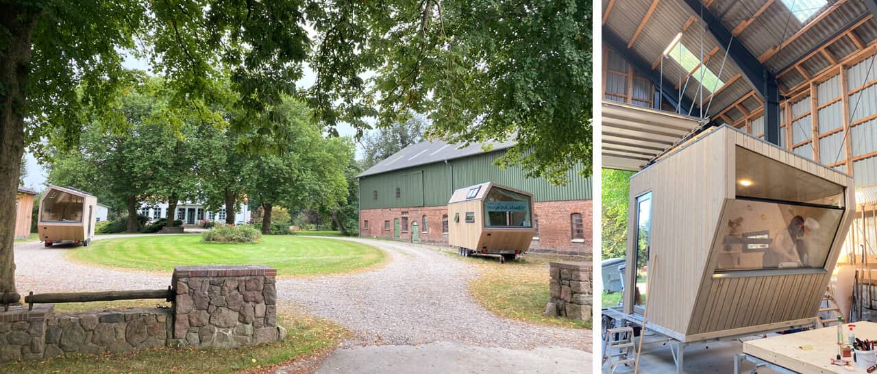 Felix hat den Hof in Stürsholz in Angeln von der Aktion Kulturland gepachtet, sein Büro und seine Wohnung hineinverfrachtet und auf die Weide den Prototypen seines Tiny Houses KAAT gestellt, den man zum Probeschlafen und Urlauben mieten kann.