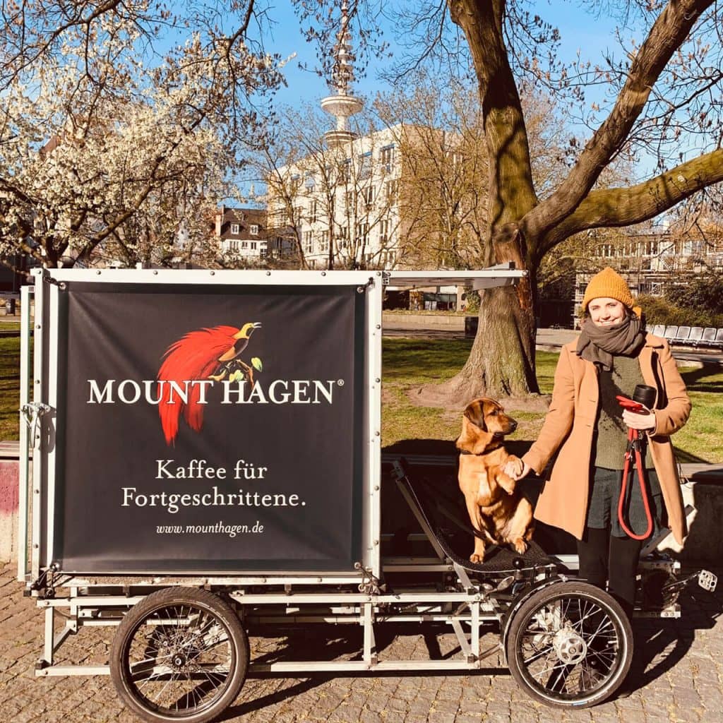 Später nochmal mit dem Hund rausgehen – und dem Kaffeebecher (sie lacht). Wenn ich diszipliniert und klar starte, und dazu kommt ungelogen immer der Mount-Hagen-Kaffee mit, dann läuft das. Das ist jetzt seit 2 Jahren mein Lieblingskaffee. Davor bin ich nie bei einer Kaffeemarke geblieben, wirklich…