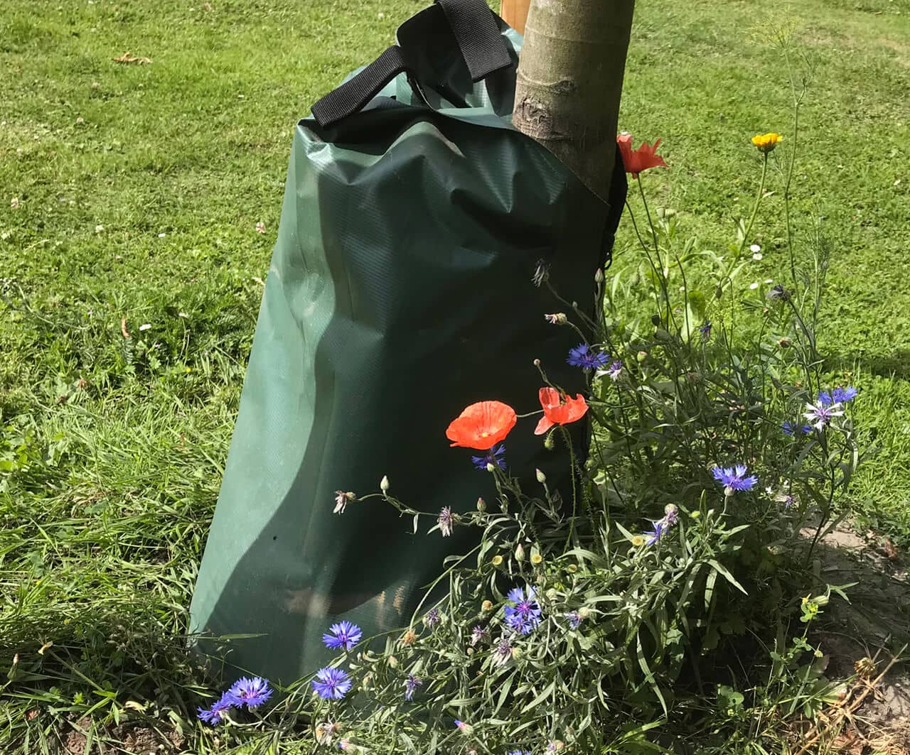 The basic principle of this kind of irrigation is: Little water, but longer. And that works quite well with the dark bags that are placed around the base of the tree like a collar. The bags slowly release water over time, that can be better absorbed by the roots compared to a flush of water from the garden hose. That does not only save time, but also valuable water – in fact, quite a lot. We think that is a great idea.