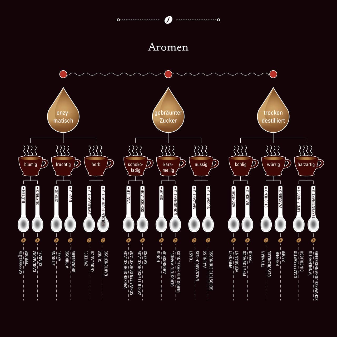 Laut SCCA gibt es 3 Hauptkategorien für das Kaffeearoma: „helle Röstung“ (enzymatisch), „mittlere Röstung“ (Zuckerbräunung) und „dunkle Röstung“ (Trocken-Destillation). Die hellen Röstungen lassen eher fruchtige, kräuterartige und blumige Aromen entstehen, wodurch der Kaffee fruchtig und säuerlich schmeckt. Mittlere Röstungen wecken nussige, karamellartige und schokoladenartige Aromen im Kaffee. Und dunkle werden würzig, kohleartig und harzig, sodass der Kaffee leicht süßlich, aber auch kräftig schmeckt.