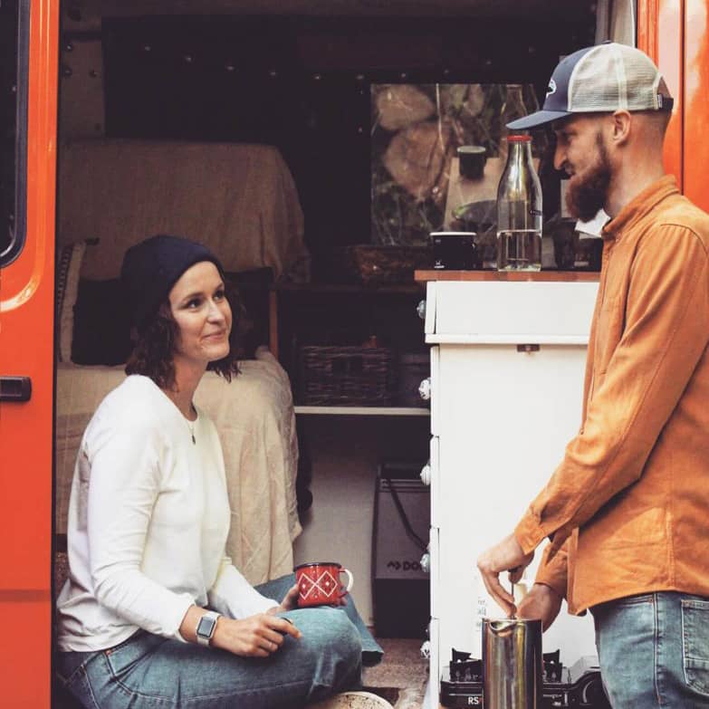Jenny und Flo vom Katrastrophenschutz-Bus erzählen uns beim Kaffee über ihre Auszeit und wie sie das Miteinander auf 5 Quadratmetern wuppen.